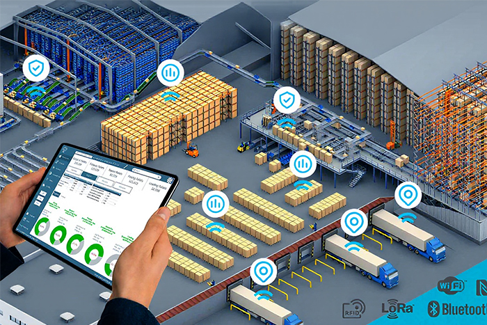 Gateways BLE e portais RFID identificam localização, movimentação e condições dos ativos.